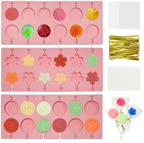 View full details303Pcs 3D Lollipop Mold Kit, CHELIZIYA 3 Shapes Lollipop Maker Molds, Non-Stick Silicone Chocolate Mold Flower Lollipop Molds with 100 Paper Sticks, 100 Clear Bags, 100 Gold Ties