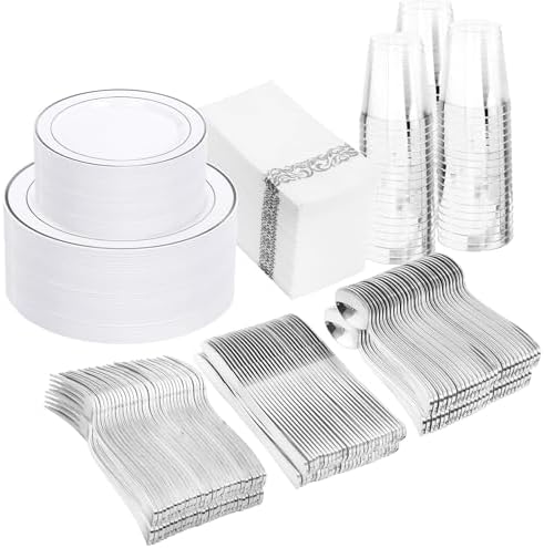 View full details350 Pcs Silver Plastic Plates - Silver Dinnerware Set of 50 Dinner Plates 50 Dessert Plate 50 Silverware 50 Napkins 50 Cups for Christmas Party&Wedding