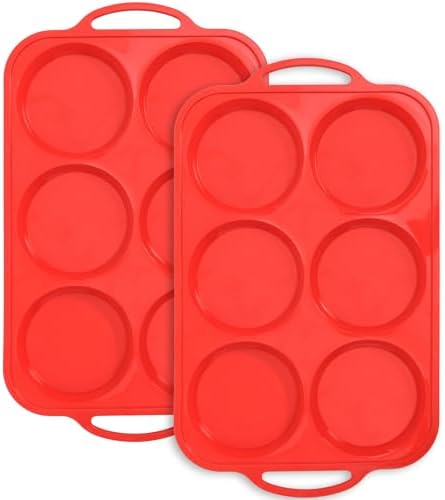 View full details4 Inch Muffin Top Pan Non Stick with Metal Frame, Silicone Egg Molds for Breakfast Sandwiches, Large Round Whoopie Pie Baking Pan with Handle for English Muffin, Egg Bite and Oven, Red
