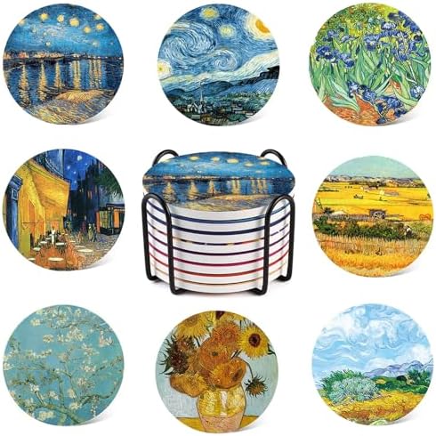 View full details4 Inch Round Marble Coasters, Van Gogh Art Painting Style Beverage Coasters with Storage Rack 8-Piece Set