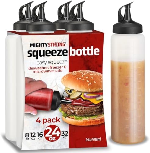 View full details4 Pack Condiment Squeeze Bottles 24 Oz –Easy Pour Sauce Bottles With Leak Proof Snap Cap, Plastic Squeeze Bottles For Sauces, Condiment Bottles, Condiment Containers, clear
