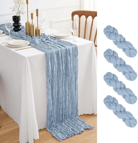 View full details4 Pack Dusty Blue Cheesecloth Table Runner 20 x 120 inch Gauze Table Runners 10 FT Long,Semi Sheer Boho Cheese Cloth Fabric Table Runner Bulk for Wedding,Party,Baby Shower,Bridal Shower Decoration