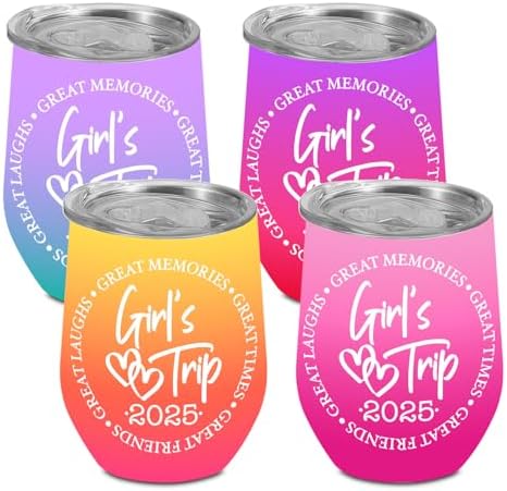 View full details4 Pcs Girls Trip Wine Tumbler With Lid, 12 OZ Stainless Steel Tumbler, Girls Trip Gifts Favors Insulated Coffee Cup, Travel Mug Weekend Gifts for Friendship Vacation Bachelorette Party