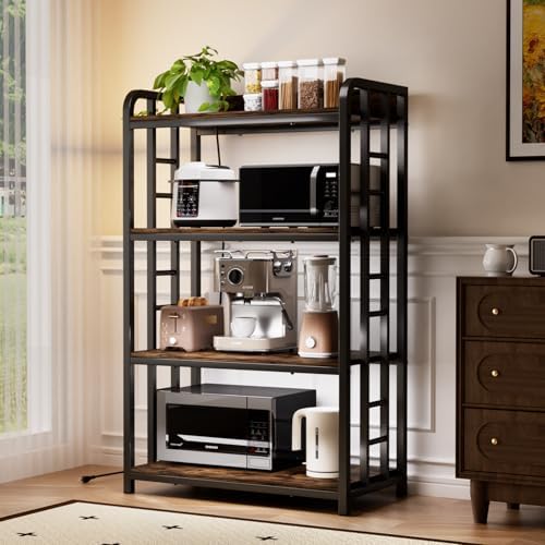 View full details4-Tier Rustic Brown Bakers Rack, Black Frame, Top Power Outlet, 70lbs/Shelf, 2 Adjustable Shelves, Small Kitchen & Coffee Bar