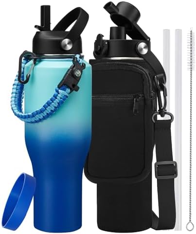 View full details40 oz Insulated Water-Bottle fit in Car Cup-Holder - Leakproof Tumblers Water Cup with Straw Keep Cold 48H & Hot 24H, T-shape Stainless Steel Water Bottle Metal Flask w/Paracord Handle, Carrier Bag