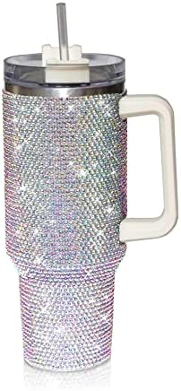View full details40 Oz Rhinestone Studded Tumbler with Handle Straw and Lid, Insulated Stainless Steel Double Layer Water Bottle for Women, Reusable Travel Coffee Mug (1200ml) White AB