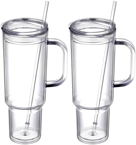 View full details40 oz plastic tumbler with handle and Straw Lid,clear tumbler,Double Wall Vacuum Reusable plastic Water Bottle Travel Mug Cup,Classic Acrylic Tumblers (2 Pack)