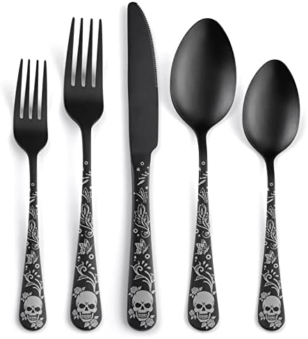 View full details40 Piece Skull Pattern Matte Silverware Set for 8, Black Flatware set Service for 8,Gothic Unique Skull Pattern Design,18/0 Stainless,Satin Finish Cutlery for 8,Dishwasher Safe