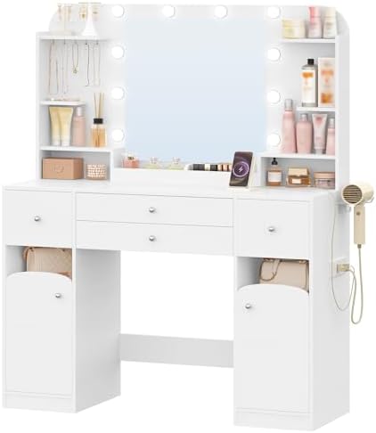 View full details42.5" Large Vanity Desk,Dressing Table with Mirror and LED Light, Power Strip, 4 Drawers, 2 Open Storage Cabinets, and Jewelry Storage for Bedrooms, White
