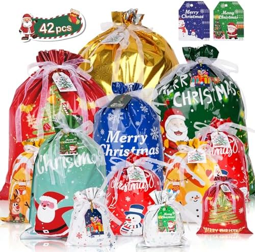 42PC Christmas Drawstring Gift Bags, Christmas Gift Bags Bulk with Tags & Ribbon Ties, Holiday Bags for Party Favors, Assorted Sizes for Xmas Candy Presents Wrapping Bags - Large Medium Small