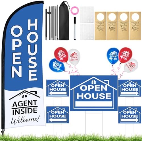 View full details44 Pcs Open House Signs for Real Estate Agent Supplies, Double Sided Open House Flag Kit for Outside, 7.6 x 5.4 Ft Blue Banner Flag Poles Set with Directional Arrows Yard Sign Stakes Balloons