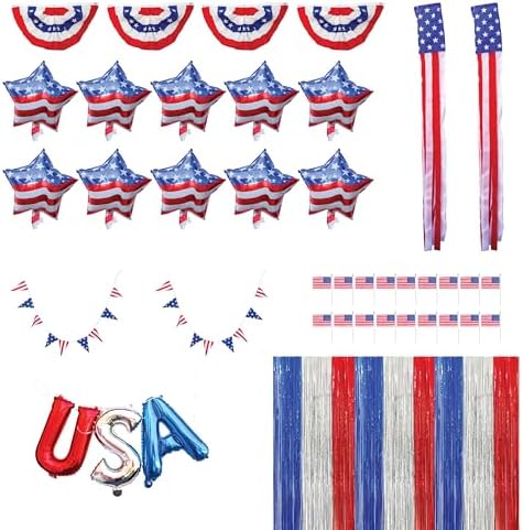 View full details45 PC 4th Of July Decorations, USA Independence Day Patriotic Décor Set, American Bunting & Windsock Flags, Red White & Blue Streamer Backdrop, 10 Aluminum 1 “USA” Balloon, 2 Garland 8.2’, 18 flags