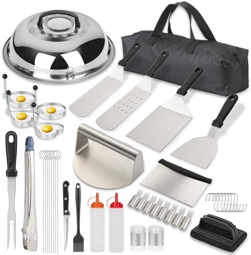 View full details45 Pcs Griddle Accessories Kit, Flat Top Grill Accessories Set for Blackstone and Camp Chef, Griddle Grill Tools Set,w/Carry Bag, Enlarged Spatulas, Basting Cover, Scraper for Outdoor Barbecue(Silver)