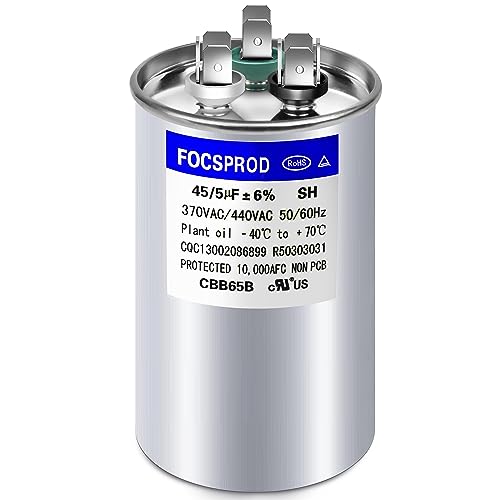 View full details45+5 uF 45/5 MFD ±6% 370V/440V CBB65 AC Capacitor, Dual Run Round Capacitor Replacement, 45 5 uF 440 Volt HVAC Capacitor for AC Unit Fan Motor Start or Heat Pump or Condenser Straight Cool