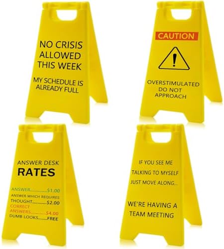 View full details4Pcs Funny Office Desk Decor Caution Overstimulated Desk Warning Sign Accessories Cubicle Decorations Work Gag Gifts for Birthday Christmas White Elephant Women Men Coworker Employee Boss Manager
