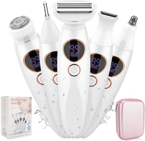 View full details5 in 1 Bikini Trimmer for Women,IPX7 Waterproof Cordless Replaceable Pubic,Eyebrow,Facial Electric Razors&Nose Hair Trimmer&Painless Body Shaver for Arms Legs Underarms,USB Charge,LED Display,Wet&Dry