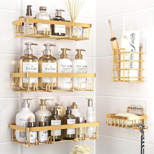 View full details5 Pack Shower Caddy Organizer Rack Shelf for Inside Shower, Self Adhesive Wall Storage Basket Rustproof Stainless Steel Shampoo Holder Bathroom Accessory Decor Set, Gold