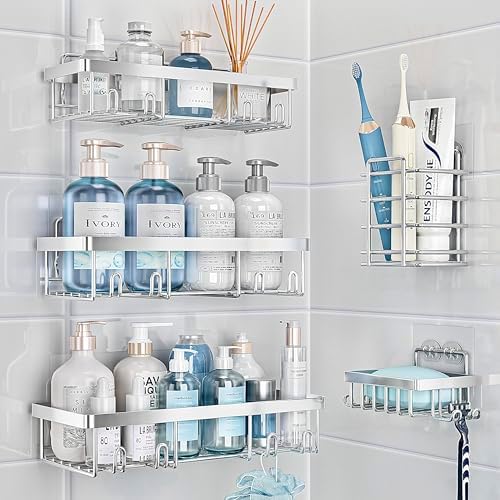 View full details5 Pack Shower Caddy Organizer Rack Shelf for Inside Shower, Self Adhesive Bathroom Wall Storage Basket Rustproof Stainless Steel Large Capacity Shampoo Holder, Silver