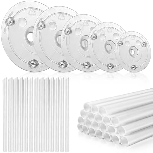 View full details5 Pieces Cake Separator Plates Stands with 24 Pieces Plastic Cake Dowels Rods and 15 Pieces Clear Cake Sticks Support Stacking for 4 6 8 10 12 Inch Tiered Cakes