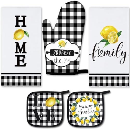 View full details5 Pieces Buffalo Plaid Kitchen Towels Oven Mitts and Pot Holder Set Black and White Kitchen Towels Oven Gloves, Hot Pads Pot Holders for Farm House Accessories Decor(Lemon)