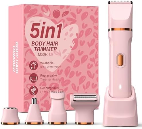 View full details5-in-1 Bikini Trimmer for Women, IPX7 Waterproof Electric Razors Shaver, Cordless Body Hair Trimmer, Facial & Pubic Hair Removal, Ceramic Blade (Pink)
