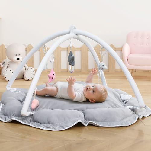 【Newborn Baby Essentials】Baby play gym mat comes with 3 cute and fun hanging toys(sun, star, moon) that rattle when touched; 3 matching teething...