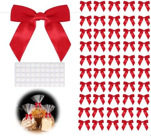 View full details50pcs Red Twist Tie Bows, 3.5" Satin Ribbon Pre Tied Small Red Bows for Gifts Wrapping Treat Bags Candy Card, Little Red Bows for Crafts Wedding Bridal Baby Shower Birthday Christmas Tree Decorations