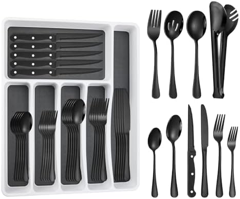 View full details53PCS Black Silverware Set for 8 with Cutlery Drawer Organizer, Stainless Steel Flatware Set with Steak Knives, Include Spoons and Forks Set & Serving Utensils, Mirror Polished