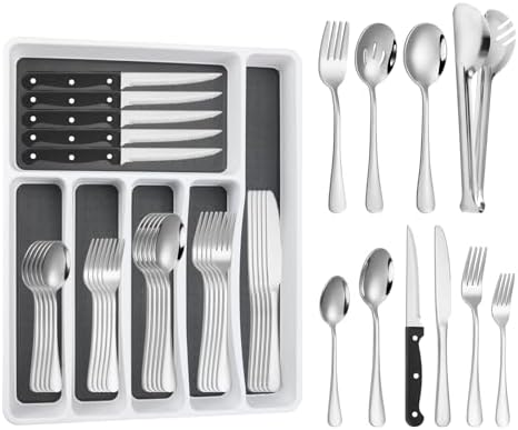 View full details53PCS Silverware Set for 8 with Flatware Drawer Organizer, Stainless Steel Cutlery Set with Steak Knives, Include Spoons and Forks Set & Serving Utensils, Mirror Polished, Silver