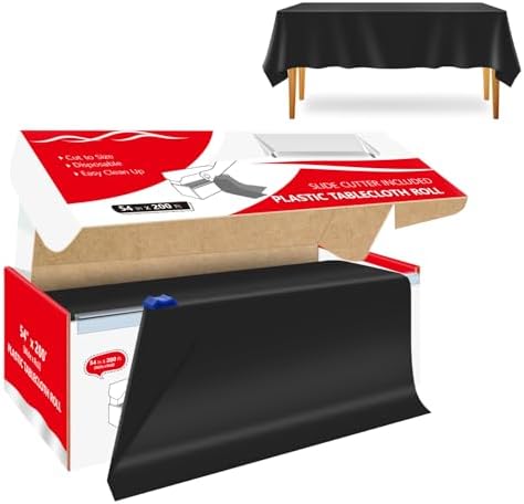View full details54 Inch x 200 Feet Black Plastic Tablecloth Roll Cut to Size Disposable Table Cover with Cutter Box Plastic Table Cloth for Party, Wedding, Birthday