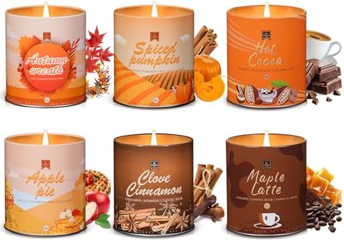 View full details54oz Winter Fall Scented Candles Set, 6Pack Soy Wax Candles House Warming Halloween Christmas Gifts, 9oz Halloween Chirstmas Candles for Women Men Apple Pie/Cinnamon/Pumpkin/Vinilla/Hot Cocoa Candle