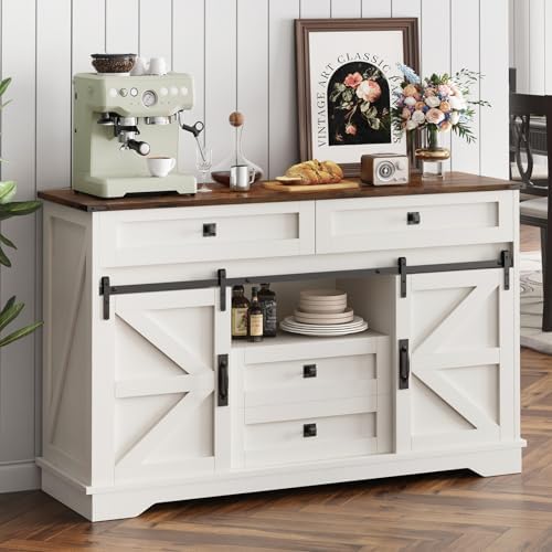 View full details55" Farmhouse Buffet Cabinet, Kitchen Sideboard with Sliding Barn Doors and 4 Drawers, Rustic Wood Storage Cabinet with Adjustable Shelves, 35'' Tall Coffee Bar Table for Dining Room, White
