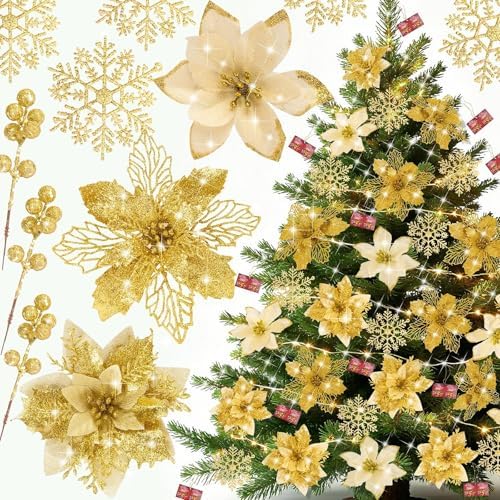 View full details59PCS 6 Style Poinsettia Flowers Artificial Christmas Tree Decorations Gold Christmas Ornaments with Berry Stems Snowflakes Cards for Wreath Fireplace Stairs Xmas Tree Decor