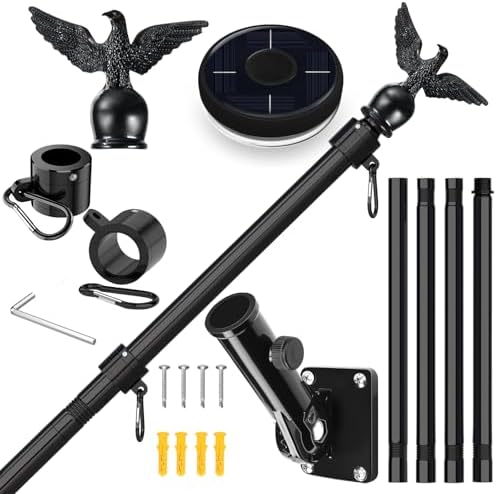 View full details5FT Flag Pole Kit for House with Solar Light and Adjustable Bracket, 1" Thickened Stainless Steel Outside Wall Mount Flagpole for 3x5 American Flag, for Residential, Outdoor or Porch (Black)