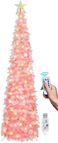 View full details6 FT Pop Up Christmas Tree with 100 LED Timer Lights & Remote, Pink Collapsible Christmas Tinsel Tree Artificial Pencil Tree Xmas Decoration for Holiday Home Office Party, USB Powered