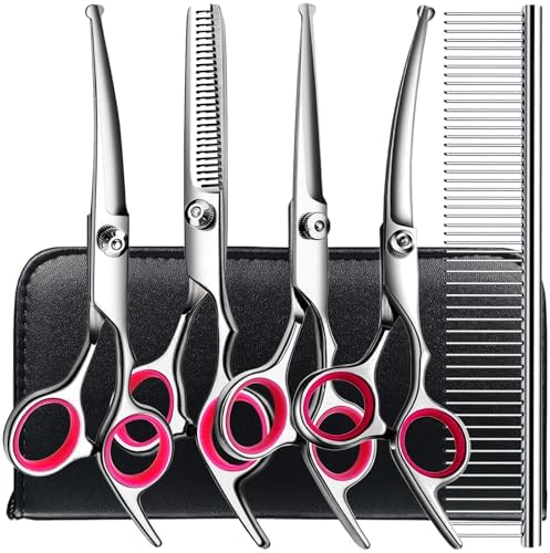 6 in 1 Dog Grooming Scissors Kit : Dog scissors kit includes 1 dog thinning shears, 2 dog curved scissors, 1 dog straight scissors, 1 grooming c...