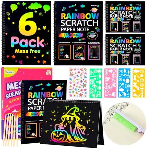 View full details6 Packs Rainbow Scratch Notebook, Scratch Art for Kids with Reusable Cleaner Tool, Halloween Crafts for Kids, Stocking Stuffers, Art Supplies, Christmas Gifts for 4 5 6 7 8 9 Year Old Girl Boy