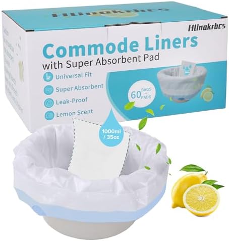 View full details60 Pack Commode Liners with Absorbent Pads(Lemon Scent),Bedside Commode Liners Disposable for Portable Toilet,Adult Commode Chair Bucket & Porta Potty,Camping Toilet Bags