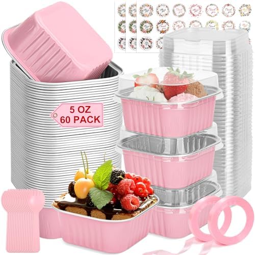 View full details60 Pack Mini Cake Pans with Lids and Spoons, 5oz Square Aluminum Foil Loaf Pans Pink Small Cake Tins Disposable Baking Pans Dessert Cupcake Cups with Ribbon Decals for Wedding Birthday Party Picnics