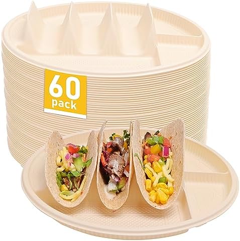 View full details60 Pack Disposable Taco Plates With Dipping Sides, Biodegradable Cornstarch Taco Holder for Party, Large Size Fit for 6-8 Inch Large Tortilla, Microwave Safe