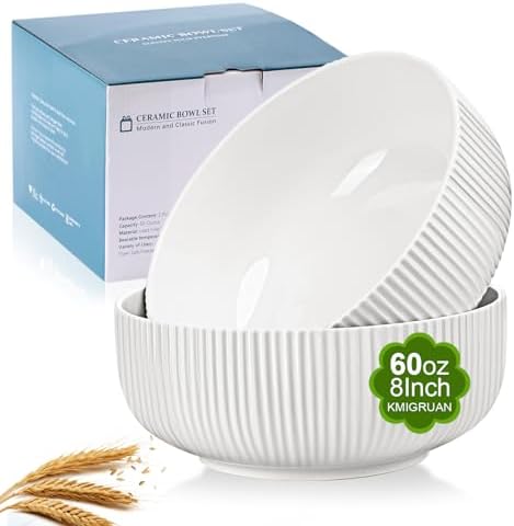 View full details60oz Salad Bowl Set,2 Pack Serving Bowls for Entertaining,8inch Large White Ceramic Bowl for Side Dishes,Soup, Pho, Cereal, Pasta, Fruit, Microwave and Dishwasher Safe