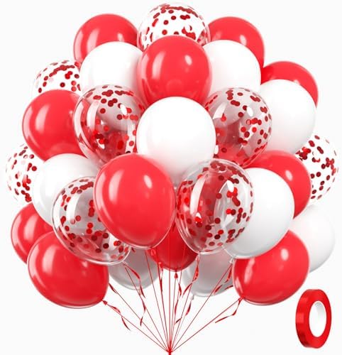Package Include: The red and white balloons include 12inch red balloonsx25, 12inch white balloonsx25, 12inch red confetti balloonsx10, glue dots...