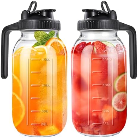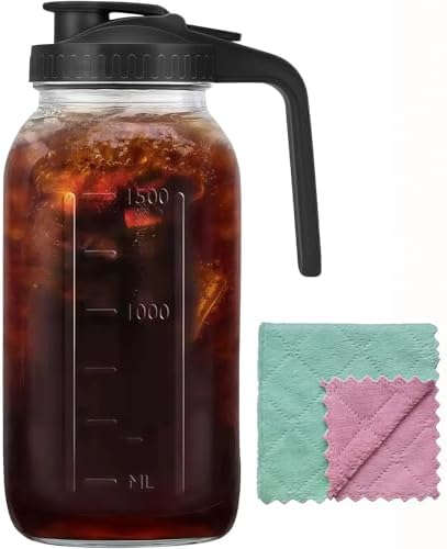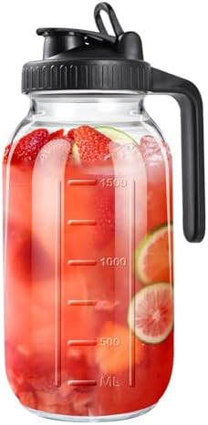View full details64oz Glass Pitcher Carafes With Handle and Lid, 2 Quart Mason Jar, Large Water Jug, Glass Containers for Fridge, Water Pitcher for Juice, Iced & Sun Tea, Cold Brew Coffee, Homemade Beverage