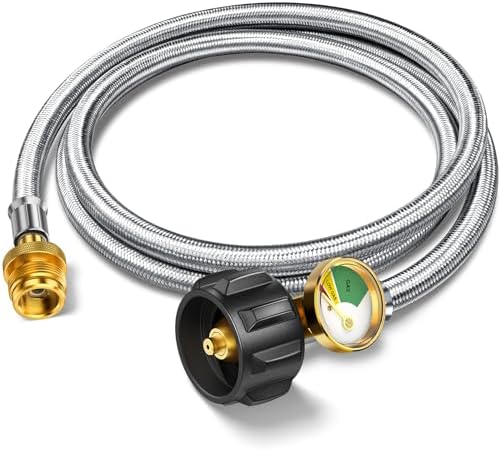 View full details6Ft Stainless Braided Propane Regulator Hose with Gauge,QCC1 Low Pressure Propane Tank Extension Hose for 20lb Tank with Elbow Adapter for Blackstone Grill,Most LP Gas Grill,Heater Fire Pit Table