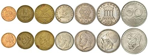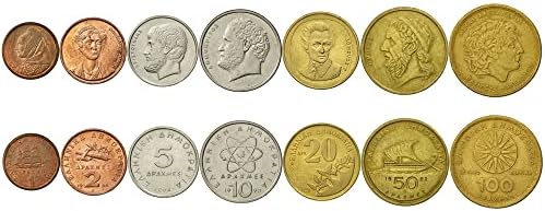 View full details7 Coins from Greece,Greek Coin Set Collection 1 2 5 10 20 50 100 Drachmes,Circulated 1982,2000,Alexander The Great,Laskarina Bouboulina,Aristotle,Democritus,Dionysios Solomos,Homer,Anchor,Atom,Cannon