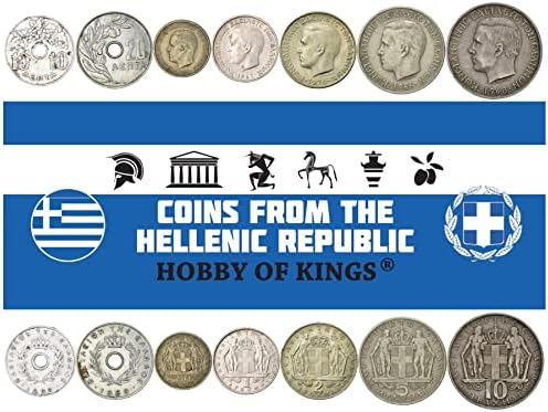 7 Coin Set from Greece also known as (Hellenic Republic, Ελληνική Δημοκρατία). Denominations: 10, 20, 50 Lepta, 1, 2, 5, 10 Drachmai. Each produ...