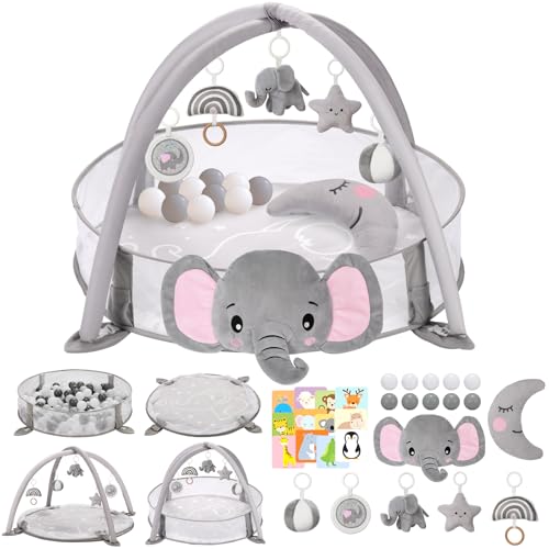 View full details7-in-1 XL Large Baby Play Gym Mat, Tummy Time Mat, Baby Activity Mat, Baby Gym & Ball Pit with Tummy Time Pillow, 10 Balls, Milestone Cards & 5 Detachable Toys Elephant