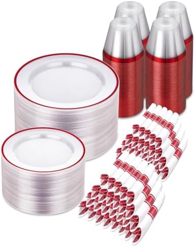 View full details700PCS Clear Red Disposable Plastic Dinnerware Set for 100 Guests, 200 Plastic Plates, 100 Cups, 100 Pre-Rolled Napkins with Cutlery for Party, Christmas, Birthday, Wedding, Thanksgiving, Halloween