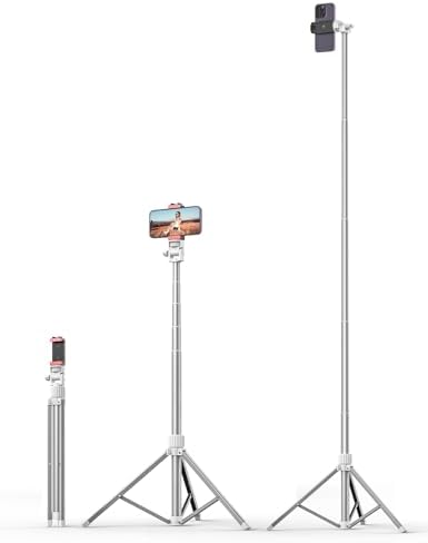View full details71'' Phone Tripod Stand, Extendable Reinforced Aluminum Phone Stand with Wireless Remote, Stable Cellphone Tripod Compatible with iPhone 14/13/12 Galaxy S23/S22 Huawei (White)