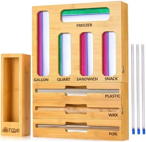 View full details9-in-1 Bamboo Storage Bag Organizer with Cutter, Kitchen Drawer & Wall Mount Storage for Foil, Plastic Wrap, Gallon, Quart, Sandwich, Snack & Freezer Bags, Fits Rolls ≤12” Long, ≤2” Diameter